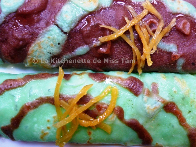 Voilà de délicieuses crêpes colorées, au parfum délicat de pandanus, à la douceur de la noix de coco et du cacao, relevées par le goût corsé du gingembre… Mmmh… Un grand moment de gourmandise !